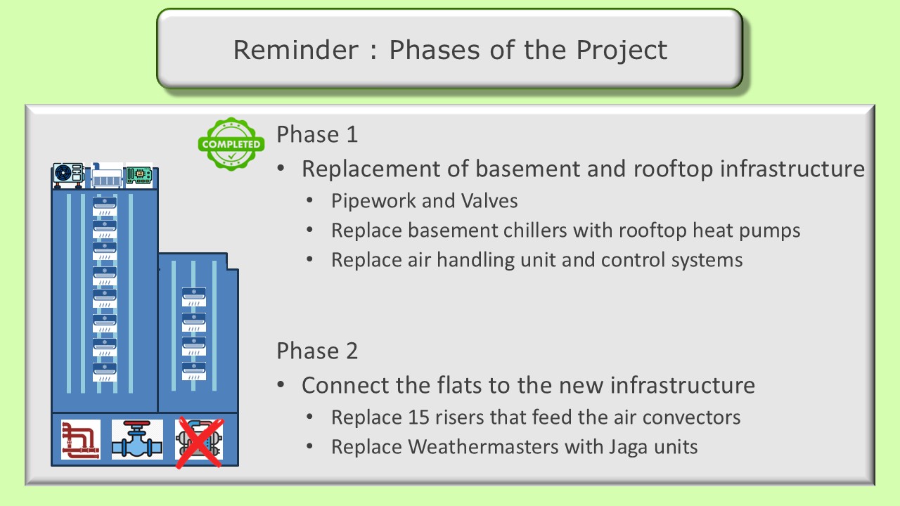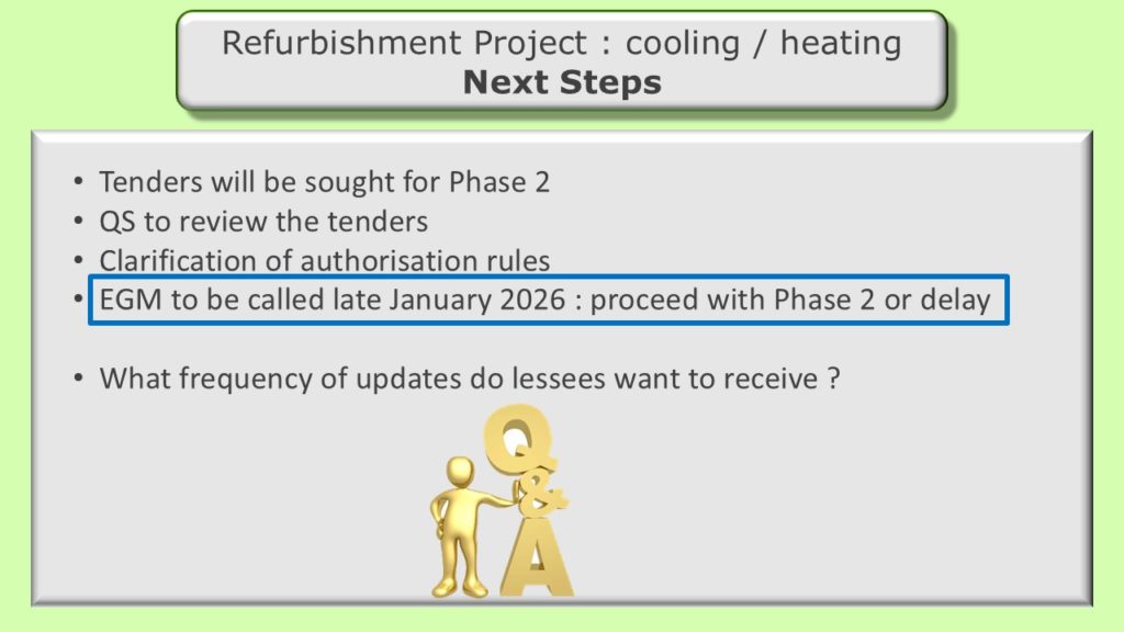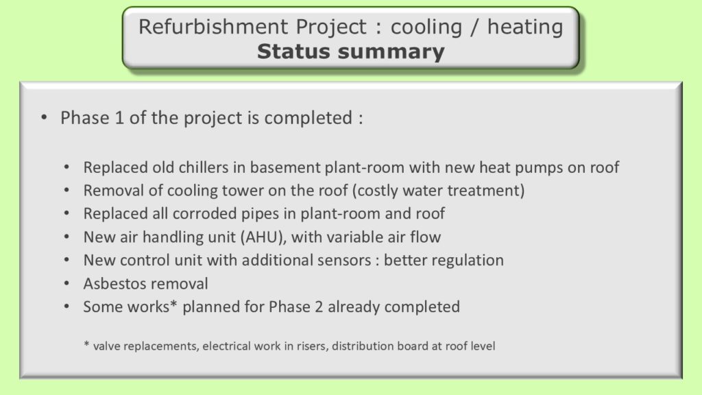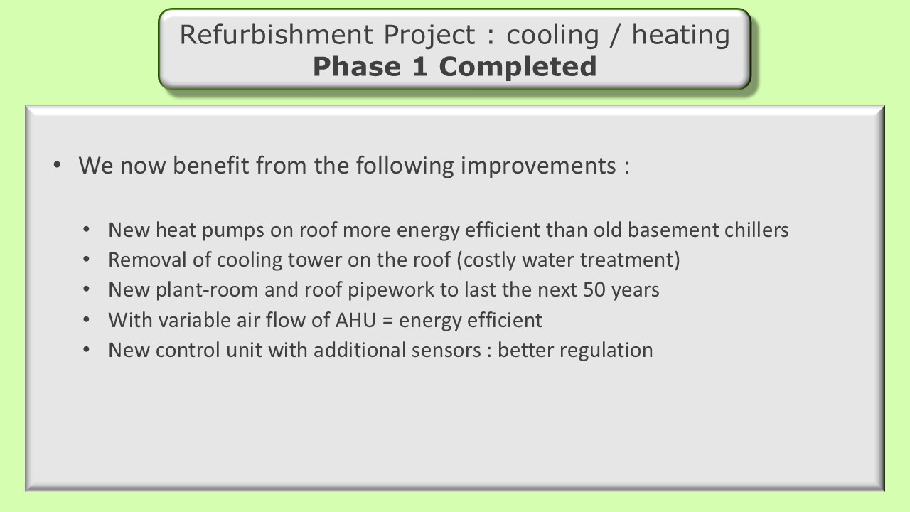 Phase 1 of our heating/cooling refurbishment project is now complete. Much of the discussion during the AGM focused on the need for improved governance, monitoring of costs and communication to lessees and other residents. Prior to proceeding with the next phase of the project, an independent surveyor will be tasked with verifying cost estimates of the remaining works, validating the approach and plan or recommending changes that can reduce the costs, shorten the timeline or improve performance.