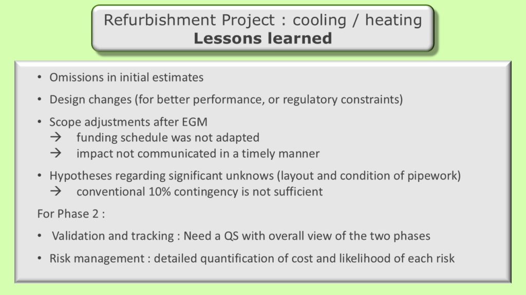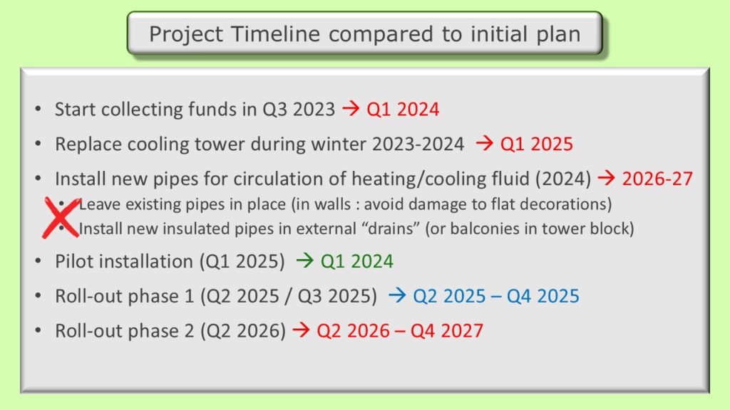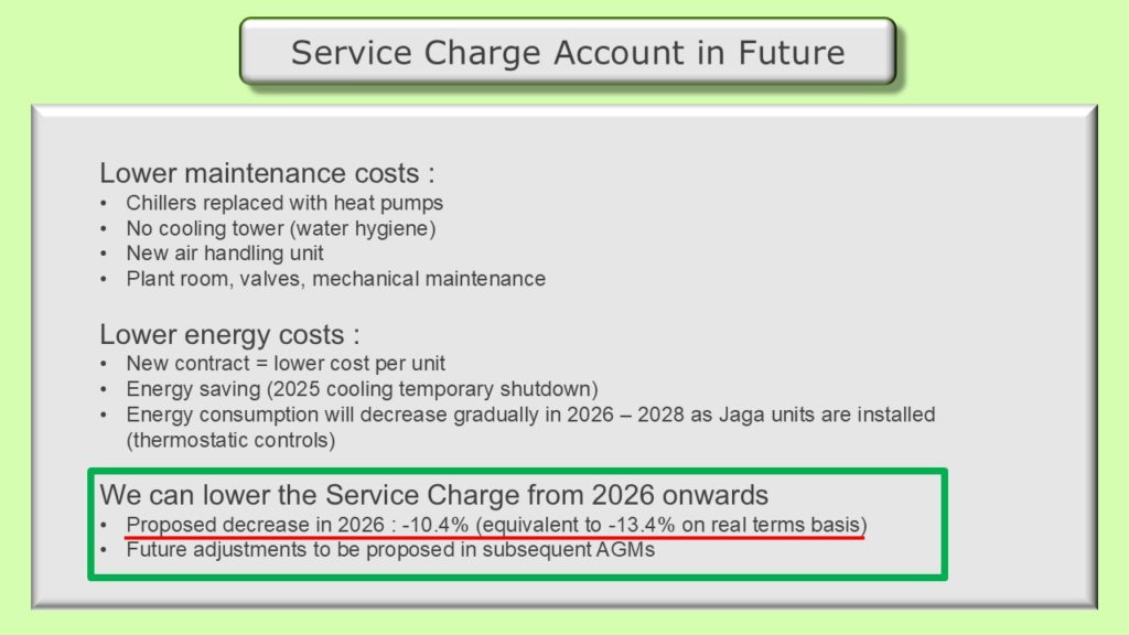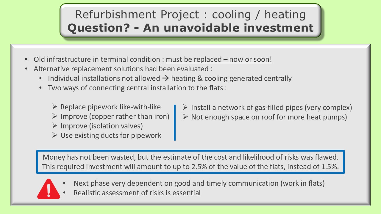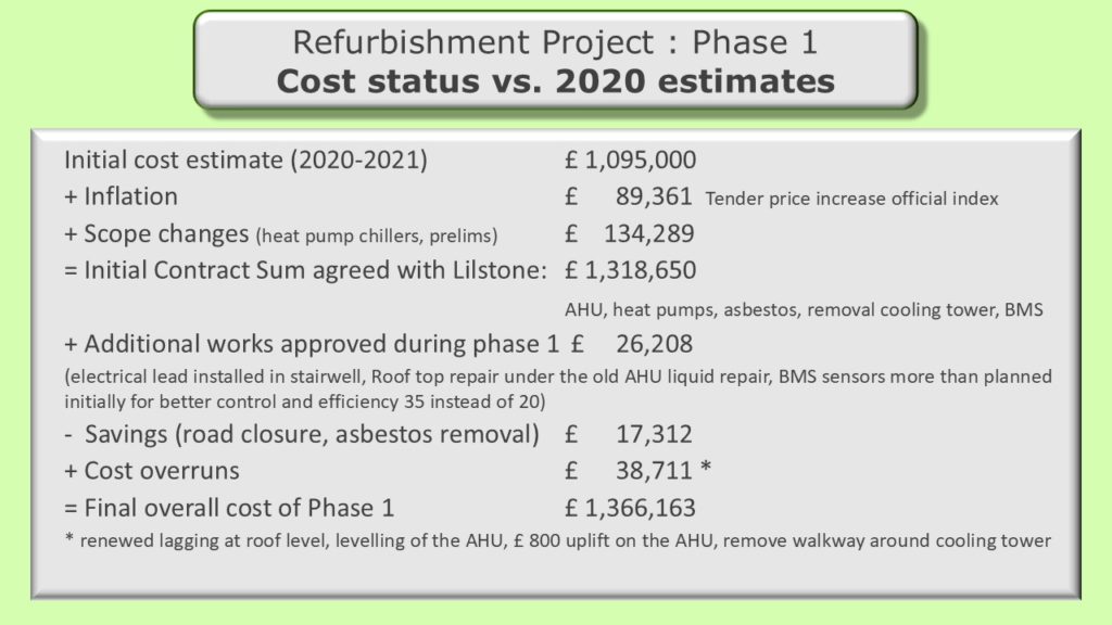 Phase 1 of our heating/cooling refurbishment project is now complete. Much of the discussion during the AGM focused on the need for improved governance, monitoring of costs and communication to lessees and other residents. Prior to proceeding with the next phase of the project, an independent surveyor will be tasked with verifying cost estimates of the remaining works, validating the approach and plan or recommending changes that can reduce the costs, shorten the timeline or improve performance.